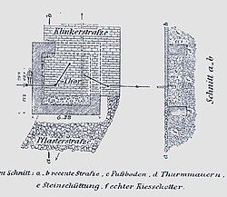 | Wachturm West in Fischamend, n.d. Ausgrabungsbefunden von 1902 | Maximilian von Groller-Mildensee: 1902, (Der Römische Limes in Österreich) | unbekannt | Datei:Fischamend W-WT 1902.jpg | |