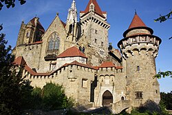 | Westansicht der Burg Kreuzenstein in der niederösterreichischen Marktgemeinde Leobendorf . Die ursprüngliche Burg wurde im Zuge des 30-jährigen Krieges zerstört und anschließend als Baumaterial großteils abgetragen. Unter Graf Johann Nepomuk Wilczek erfolgte von 1874 bis 1906 ein Wiederaufbau der Burg als Museum für seine umfangreichen Kunstsammlungen. Die so entstandene Schauburg ist heute, ergänzt durch zahlreiche wiederverwendete mittelalterliche Bauteile und nach teilweiser Beseitigung der Brandschäden von 1915 und der Kriegsschäden von 1945, ein beliebtes Tourismusziel nördlich von Wien . | Eigenes Werk | C.Stadler/Bwag | Datei:Kreuzenstein Westansicht.JPG |