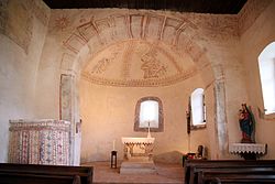 Über dem Langhaus ist eine flache Holzdecke. Die Empore aus Holz hat eine vertäfelte Brüstung. Der breite Triumphbogen erscheint hufeisenförmig. Über der Apis zeigt sich eine Schale.