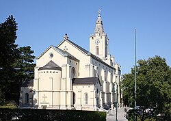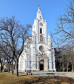 | Westsüdwestansicht der röm.-kath. Stadtpfarrkirche hl. Jakobus der Ältere in der niederösterreichischen Stadtgemeinde Bad Vöslau . Die gewestete Saalkirche mit dominanter Osturmfassade im romantischen Rundbogenstil am Übergang zum strengen Historismus wurde von 1860 bis 1870 nach Plänen des Architekten Franz Sitte errichtet. Die vom Grafen Moritz II. von Fries (1804–1887) gestiftete Kirche ist das Hauptwerk des Architekten und der bedeutendste Sakralbau der Zeit im südlichen Niederösterreich. | Eigenes Werk | C.Stadler/Bwag | Datei:Bad Vöslauer Pfarrkirche.JPG | |