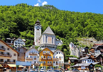 | Ostansicht der katholischen Pfarrkirche Mariä Himmelfahrt der oberösterreichischen Marktgemeinde Hallstatt . Eine große weiträumige spätgotische Hallenkirche mit einem zweischiffigen, quadratischen Langhaus und einem Doppelchor. | Eigenes Werk | C.Stadler/Bwag | Datei:Hallstatt - katholische Pfarrkirche.JPG | |