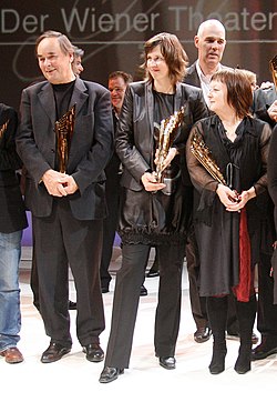 Johann Adam Oest (Beste Nebenrolle), Cornelius Obonya (nominiert für den Spezialpreis), Kathrin Röggla (Autorenpreis), Matthias Hartmann (Spezialpreis) und Sabine Mitterecker (Theater.punkt, beste Off-Produktion) bei der Verleihung des Nestroy-Theaterpreises 2010 im Burgtheater in Wien . | Eigenes Werk | Manfred Werner - Tsui | Datei:Nestroy 2010 (39) Preisträger.jpg | |