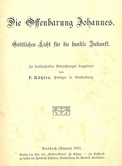 | Title page of a commentary of the book of Revelation, written by Pastor Köhler from Gnadenburg, a Lutheran village in Russian Caucasus (today Winogradnoje, North Ossetia-Alania, Russia) | Eigenes Werk | Rehabeam | Datei:Title page of a commentary of the book of Revelation, written by Pastor Köhler from Gnadenburg, a Lutheran village in Russia (today Winogradnoje, North Ossetia-Alania, Russia).jpg |