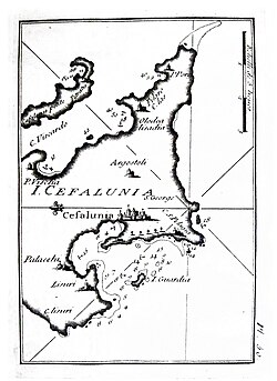 Kefalonia ist die größte Ionische Insel und zugleich die militärisch wichtigste, da sie den Golf von Patras und damit auch die Einfahrt in den Isthmus von Korinth versperrt.[3] Sie ist überwiegend gebirgig, die höchste Erhebung ist der 1628 m hohe Berg Enos.