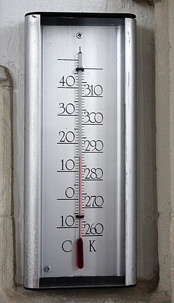 | A thermometer calibrated in both kelvins and degrees Celsius . Photographed in St Stephens Church, Nijmegen , Netherlands. The thermometer itself was located in a niche in one of the columns supporting the nave . | Eigenes Werk | Martinvl | Datei:CelsiusKelvinThermometer.jpg | |