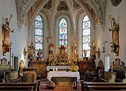 | Blick in Richtung Chorraum in der röm.-kath. Pfarrkirche hl. Martin in der oberösterreichischen Gemeinde Kematen an der Krems . Die Hochaltarfiguren des barocken Marienaltar sind Werke des Bildhauers Johann Georg Schwanthaler und stellen die lateinischen Kirchenväter dar. Von links nach rechts: Ambrosius (Bischof mit Bienenkorb in der Hand), Hieronymus (Kardinal mit Löwen zu seinen Füßen), Gregor d. Große (Papst mit Heilig-Geist-Taube - schräg über seinem Kopf), Augustinus v. Hippo (Bischof mit (brennendem) Herzen in der Hand). Die Statue links an der Wand ist ein Nikolaus v. Myra (Bischof mit drei Kugeln in der Hand) und rechts Ulrich von Augsburg (Bischof mit Fischen). | Eigenes Werk | C.Stadler/Bwag | Datei:Kematen an der Krems - Kirche, Chorraum.JPG | |