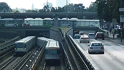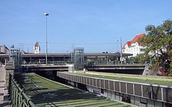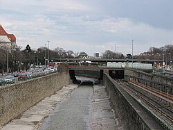 | Kennedy Bridge in Vienna, linking 13th and 14th districts separated by the Wien river, seen from the West, with underground trains and cars at an underpassKennedybrücke in Wien, die 13. und 14. Bezirk über den Wienfluss verbindet, mit U-Bahn-Zügen und Autos an der Unterführung | Eigenes Werk | Wolfgang J. Kraus | Datei:Kennedybrücke Wien mit U-Bahn.JPG | |