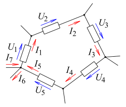 was exakt der Aussage der Maschenregel entspricht. Der Ausdruck bezeichnet dabei die Umlaufspannung für einen Weg, der die Bauelemente umgeht, aber deren Pole enthält.[3]