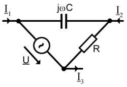 Auch ganze Netzwerke können als Knoten angesehen werden. Im Beispiel fließen die Wechselströme und in den Knoten hinein und der Strom aus dem Knoten heraus.