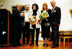 | Nach der Verleihung des ersten Stadtkultur-Preises überhaupt durch den Freundeskreis Hannover am Abend des 2. März 1995 im Beethovensaal der Stadthalle (von links): Erwin Schütterle , Geschäftsführer und Jury-Vorsitzender des Freundeskreises Hannover; Jot Claus , ausstellender Künstler; Dagmar Brand , Initiatorin des preisgekrönten Projektes "Winter - Gärten, Skulpturen in der Güntherstraße"; Ute Blohm , Organisatorin der Winter - Gärten ... ; Prof. Dr. Dr.-Ing. Dr. h.c. Klaus E. Goehrmann , seinerzeit 1. Vorsitzender des Freundeskreises Hannover e.V. ... | Freundeskreis Hannover | Freundeskreis Hannover | Datei:1995, Verleihung Stadtkulturpreis Hannover, Winter-Gärten Skulpturen in der Güntherstraße, Erwin Schütterle, Jot Claus, Dagmar Brand, Ute Blohm, Klaus E. Goehrmann.jpg | |