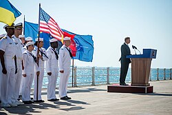 | 180815-N-WO404-540 CONSTANTA, Romania (Aug. 15, 2018) Sailors, assigned to Naval Support Facility Deveselu, Romania, stand in formation as Klaus Iohannis, the president of Romania, delivers remarks during Romanian Navy Day in Constanta, Romania, Aug. 15, 2018. U.S. 6th Fleet, headquartered in Naples, Italy, conducts the full spectrum of joint and naval operations, often in concert with allied and interagency partners, in order to advance U.S. national interests, security and stability in Europe and Africa. (U.S. Navy photo by Mass Communication Specialist 2nd Class Jonathan Nelson/Released) | 180815-N-WO404-540 | Commander, U.S. Naval Forces Europe-Africa/U.S. 6th Fleet | Datei:180815-N-WO404-540 (43335707724).jpg | |