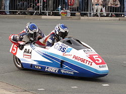 | Klaus Klaffenbock and his co-rider on a Louis Christen Racing sidecar at 2010 Isle of Man TT | Personal Archive | Agljones at en.wikipedia | Datei:Sidecar race A IMG 0433.JPG |
