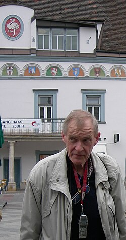 | Prof. Dr. Klaus Lederer, 63 Jahre alt, während einer Tagung der Montanistischen Universität vor dem Alten Rathaus mit dem Stadtwappen in Leoben | Eigenes Werk | Cantakukuruz | Datei:Klaus Lederer, Leoben 2005.jpg |
