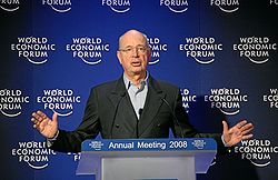 | Davos, Switzerland: Klaus Schwab , Founder and Executive Chairman, World Economic Forum, addresses the audience during the session 'Message from Davos: Believing in the Future' at the Annual Meeting 2008 of the World Economic Forum in Davos, Switzerland, January 27, 2008. | https://www.flickr.com/photos/worldeconomicforum/2296517249/ | Copyright World Economic Forum (www.weforum.org) swiss-image.ch /Photo by Remy Steinegger | Datei:Klaus Schwab WEF 2008.jpg | |
