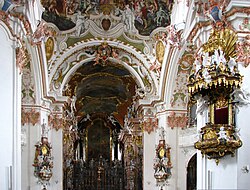 Im Jahr 1719 wurde zuerst das Obere, dann auch das Untere Münster erneuert unter dem bereits unter Johann Georg Kuen tätigen Klosterbruder Caspar Moosbrugger. Die Deckengemälde und der Stuck wurden 1724–1726 von den Brüdern Cosmas Damian Asam und Egid Quirin Asam geschaffen. Weitere Figuren und die Putti am Orgelprospekt (1749) im Kuppelraum schuf Johann Baptist Babel. Zwischen 1749 und 1751 nach Entwurf von Giuseppe Torricelli und Gian Antonio Torricelli aus Lugano[15] errichtete der Altarbildhauer und Erzgiesser Domenico Pozzi[16] aus Mailand den Hauptaltar.[17] Die lebensgrossen Figuren aus Glanzstuck an den Seitenaltären stammen von Diego Carlone aus Scaria, heute Teil von Lanzo d’Intelvi (I) nahe der Schweizer Grenze. Die Ölgemälde Tod des Hl. Benedikt und Die Muttergottes erscheint dem Hl. Meinrad schuf dessen Bruder Carlo Carlone. Der Stuckmarmor der Altäre (1730) stammt von Josef Anton Feuchtmayer. 1730 bis 1743 schuf Diego Francesco Carlone 16 Statuen, die allegorischen Verzierungen der acht alten Altäre im Hauptschiff sowie die beiden Grabdenkmäler über der Gruft der Fürstäbte. Den Stuck und Figuren im unteren Chor erneuerte 1746 bis 1750 der Malerbaumeister und Stuckateur Franz Anton Kraus aus Augsburg. Die umfassende Restaurierung der Kirche zwischen 1975 und 2001 versuchte, den durch frühere Renovierungen teilweise verfälschten Eindruck des ursprünglichen barocken Zustands wiederherzustellen.