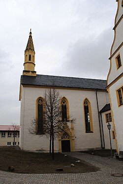 In der Laienkirche befinden sich zwei Epitaphe aus Sandstein von Personen der Familie Schwarzenberg, im Norden der von Ursula von Schwarzenberg und im Süden der von Elisabeth von Schwarzenberg. Beide starben im 15. Jahrhundert. Der südliche weist in den Ecken vier Wappen auf und trägt eine Inschrift. Sie lautet: „mcccclxvii uff sontag nach mathei verschied die edle fraw Elisabet von schwarzenberg geboren von Colowrat awß behem der got gnedig sey amen.“[30]