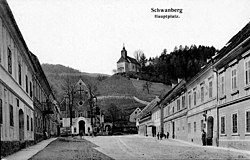 | Hauptplatz von Schwanberg, Steiermark, Österreich 1980 mit Kapuzinerkloster und St. Josefs-Kirche | Postkarte aus 1908, auf der Rückseite: Verlag Ed Körner, Schwanberg Nr. 0176 | Autor/-in unbekannt Unknown author | Datei:Schwanberg Hauptplatz 1908.jpg | |