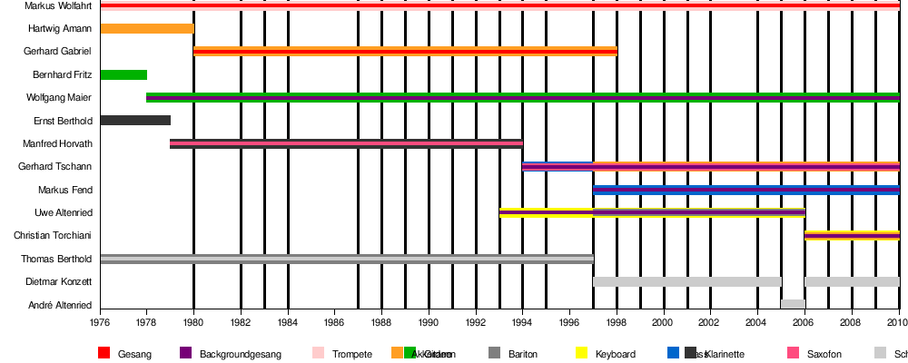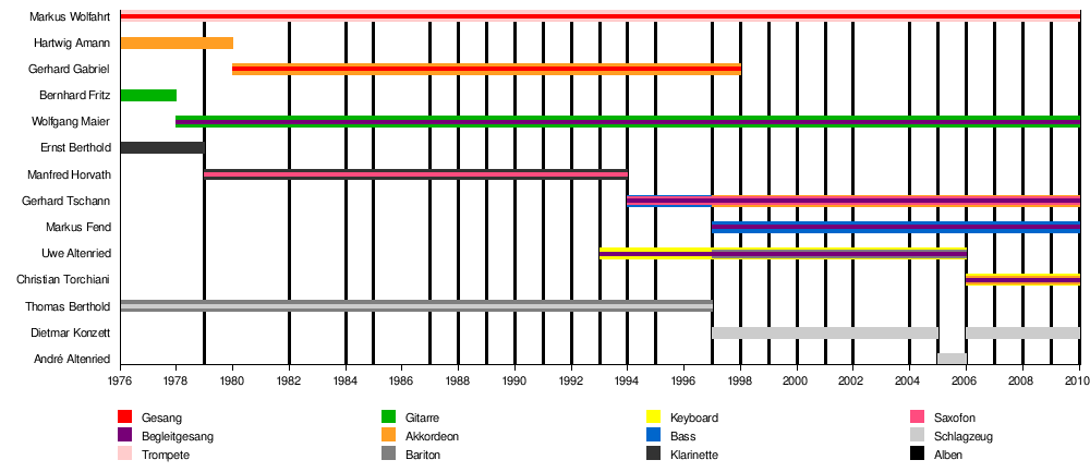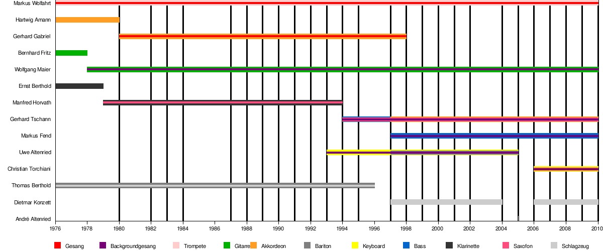 - Markus Wolfahrt (* 1. Oktober 1960 in Bregenz): Gesang, Trompete, Gitarre, Steirische, E-Bass, Bariton, Alphorn, Posaune, Flügelhorn, Komposition, Text