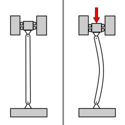 | A column exhibiting the characteristic deformation of buckling under a centric axial load. | Buckled_column.png | Buckled_column.png : Original uploader was Spindustrious at en.wikipedia derivative work: Mircalla22 ( talk ) | Datei:Buckled column.svg | |