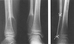Aneurysmatische Knochenzyste im unteren Ende der Fibula bei 9-jährigem Mädchen. Kontrollaufnahme zwei Monate nach Kontinuitätsresektion und Überbrückung mit einem kortikospongiösen Span aus der Tibia (oben rechts). | Rüdiger Döhler: Lexikon orthopädische Chirurgie . Springer, Berlin 2003, ISBN 3-540-41317-0 , S. 9. | Surgeon and radiographer of the child | Datei:Aneurysmatische Knochenzyste.jpg | |