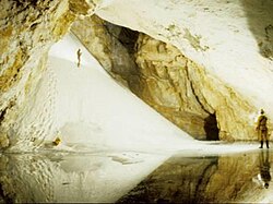 | Schneekegel in der Halle "Nordpol" im Kolkbläser-Monsterhöhlensystem. Im Spätsommer befahrbare Verbindung zur 140m oberhalb liegenden Schindelkopfriesendoline. | Andreas Emonts-Pohl | Andreas Emonts-Pohl | Datei:Kolkbläser-Monsterhöhle, Nordpol.jpg | |
