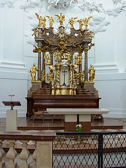 Der heutige Hochaltar wurde von Pater Bernard Stuart entworfen und von Josef Anton Pfaffinger ausgeführt. Das Programm des Hochaltares stammt aus dem Alten Testament und bezieht sich auf einen Spruch Salomos (Spr 9,1 EU): „Die Weisheit hat ihr Haus gebaut, ihre sieben Säulen behauen.“ Vor den Säulen stehen allegorische Figuren der Musik, Dichtung, Malerei und Baukunst sowie der vier Fakultäten. Darüber schweben Liebe und Hoffnung, beflügelt vom Glauben. Auf der Höhe des Gesimses stehen hier sieben Erzengel. Der Altar löst sich nach oben hin in die von Fischer von Erlach entworfenen Stuckfiguren auf. Er wiederholt die Hauptmotive der Kirche und führt sie weiter. Als oberster Abschluss des Chores erscheint vor dem hellen Fenster der Apsis umgeben von plastisch modellierten Wolken, zahlreichen Engeln und einem Strahlenkranz – gleichsam überirdisch – Maria Immaculata auf einer Mondsichel.
