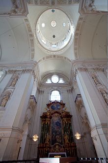 Die Kirche wird innen mit einem hoch aufragenden Tonnengewölbe in Kreuzform mit Kolossalpilastern und einer zentralen Tambourkuppel überwölbt, wobei der Bau durch die vier hohen die Hauptkuppel umrahmenden Hauptkapellen zu einem Zentralbau vereinheitlicht wird. Diese in den Kirchbau einbezogenen offenen Kapellen mit ihren Altären prägen neben dem Hauptaltar das Kircheninnere. Die beiden mittigen Querschiffaltäre sind mit je einem Altarblatt von Johann Michael Rottmayr ausgestaltet. Sie zeigen den damals wichtigsten Stadtheiligen Karl Borromäus bei Pestkranken und den Mönchsvater Benedikt, heidnische Fürsten taufend. Alle Altäre sind Werke des Hoftischlers Simon Thaddäus Baldauf (1677–1753) aus Au am Inn, und des Fassmalers Peter Paul Perwanger.