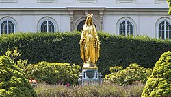 | Medallion d.= 36mm. 19 g Ag View of the School within mountains near Vienna, "KALKSBURG" in exergue, curved above "1856 - 1906."/ Maria Immaculata standing on Satan, around: "TOTA PULCHRA ES AMICA MEA ET MACULA NON EST IN TE". Wurzbach 4201. Condition: EXTREMELY FINE, original loop, old patina. | Eigenes Werk | Berlin-George | Datei:Jesuit College Silver Medal 1906 Commemorating 50 Years Kollegium Kalksburg near Vienna.Obverse..jpg | |