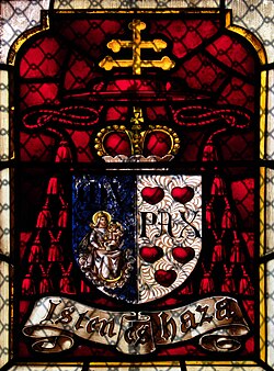 | Coat of arms of Kolos cardinal Vaszary, archbishop of Esztergom, Hungary (1891 - 1913). Spišský Štvrtok, Slovakia. Parish church, Zápoľský/Zápolya family chapel, stained-glass window. | Eigenes Werk | GiMa38 | Datei:COA cardinal HU Vaszary Ferenc Kolos3.jpg | |