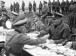 | Es folgt die historische Originalbeschreibung , die das Bundesarchiv aus dokumentarischen Gründen übernommen hat. Diese kann allerdings fehlerhaft, tendenziös, überholt oder politisch extrem sein. Zentralbild Nach der Okkupation des Sudetenlandes durch die deutschen Faschisten vom 1. bis 7. Oktober 1938. UBz.: Adolf Hitler auf der Fahrt nach dem durch deutsche Truppen besetzten Eger bei einer Imbiss-Pause auf der Straße zwischen Franzensbad und Eger am 3.10.1938. von rechts: General Wilhelm Keitel, Konrad Henlein, Adolf Hitler, General Walter von Reichenau, Reichsführer-SS Heinrich Himmler und General Heinz Guderian. 13018-38 | Dieses Bild wurde im Rahmen einer Kooperation zwischen dem deutschen Bundesarchiv und Wikimedia Deutschland aus dem deutschen Bundesarchiv für Wikimedia Commons zur Verfügung gestellt. Das deutsche Bundesarchiv gewährleistet eine authentische Bildüberlieferung nur durch die Originale (Negative und/oder Positive), bzw. die Digitalisate der Originale im Rahmen des Digitalen Bildarchivs . | Autor/-in unbekannt Unknown author | Datei:Bundesarchiv Bild 183-H13192, Adolf Hitler im Sudetenland.jpg | |