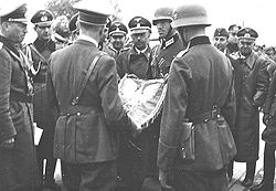 | Himmler (hinter der kleinen Fahne) mit Hitler (Rücken links der Fahne) und Konrad Henlein (ganz rechts) (Gauleiter Sudetenland) in Polen September 1939 | Eigenes Werk | Picture from Josef Gierse, my dead uncle, I am the heir of the picture | Datei:Himmler with Hitler, Poland september 1939.jpg |