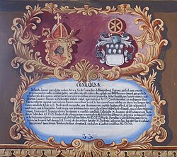 | Wappentafel von Konrad IV. von Klingenberg, Fürstbischof von Freising, im Fürstengang zwischen Fürstbischöflicher Residenz und Freisinger Dom. Links das geistliche, rechts das persönliche Wappen, darunter ein lateinischer Text mit kurzer Biographie. | Photo from the Fürstengang in Freising | Franz Joseph Lederer (1676-1733) and others | Datei:Fürstengang Tafel 33 - Konrad IV. von Klingenberg.jpg | |