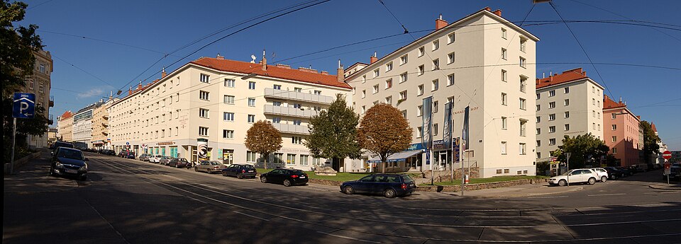 | Panorama der Front des Kopenhagen-Hofes an der Billrothstraße und Schegargasse im 19. Wiener Gemeindebezirk Döbling | Geiserich77 : de:File:KHH1.jpg , de:File:KHH2.jpg , de:File:KHH3.jpg , de:File:KHH5.jpg , de:File:KHH6.jpg , | Geiserich77 gestitcht von Regi51 | Datei:Pano KHH.jpg |