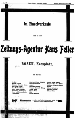 | Advertisement for the Feller Newspapers Agency on the Bozen-Bolzano's Kornplatz Nov 29, 1902 | Bozner Zeitung Nov. 29, 1902 | Autor/-in unbekannt Unknown author | Datei:BZZ 1902 11 29 11 Agentur Feller KORNPLATZ.png | |