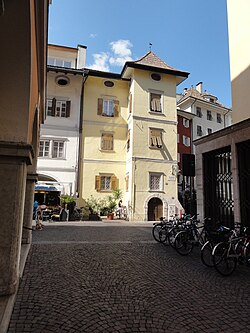 ![]() Der Kornplatz in Bozen, mittig Haus Nr. 10 (ehemaliger Kapaunwirt) |