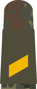 - ↑ Aus Platzgründen verkürzte Bilduntertitel. Gemeint sind jeweils Heeresuniformträger, Luftwaffenuniformträger und Marineuniformträger. Die neben der Aufschiebeschlaufe für Heeresuniformträger abgebildete jägergrüne Flachlitze deutet auf einen Soldaten der Panzergrenadiertruppe, der Infanterie oder der Spezialkräfte hin. Neben den hier auf den Schulterklappen aufgeschoben abgebildeten Aufschiebeschlaufen für die Feldbluse im fünffarbigen Flecktarnmuster gibt es noch etliche weitere Dienstgradabzeichentypen, die im Artikel →„Dienstgradabzeichen der Bundeswehr“ ausführlicher dargestellt werden.