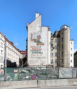 | Sujet der Gewürzhandeslfirma Kotányi in der Nussdorfer Strasse im 9. Wiener Gemeindebezirk Alsergrund . Das Sujet wurde um 1963 von der Firma Stern Schilder & Siebdruck an der Westwand des Hauses Latschkagasse 4 angebracht. Anfang der 1970er Jahre wurde direkt an die Wand das Finanzamt für den 9., 18., 19. Bezirk und Klosterneuburg angebaut. Nachdem dieses im Jahr 2012 in die Marxergasse 4, 1030 Wien umzog, wurde das ehemalige Finanzamt im Jahr 2016 abgetragen, dabei kam das Sujet wieder zu Tage. | Eigenes Werk | C.Stadler/Bwag | Datei:Alsergrund (Wien) - Nussdorfer Straße, Kotanyi-Sujet.JPG | |