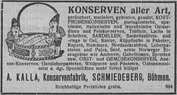 1943, so berichtet eine Chronik der Stadt[12] aus demselben Jahr, beschäftigte der Betrieb Kallas in Schmiedeberg 400 Mitarbeiter, verarbeitete jährlich 2.500 Tonnen Rohfisch, 300 t Zwiebeln, 130 t Salz, 300 t Gurken und 200.000 Liter Essig. Zusammen mit der kleineren Fischfabrik E. Lienert in Schmiedeberg bekam Kalla 280 Waggon Fisch pro Jahr geliefert, vorwiegend Hering. Die Metallabteilung des Betriebs stellte jährlich eine Million Dosen her. Kallas Werbespruch lautete: „Jedes Kind, jeden Tag einen Bückling“.