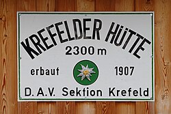 | Schild der Krefelder Hütte am 24. Juli 2014 | Eigenes Werk | Hopfenmalz | Datei:Krefelder Hütte Schild.jpg | |