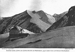 | Krefelder Hütte (2290m der Sektion Krefeld) am Kitzsteinhorn, gegen Hohen Tenn und Kleines Wiesbachhorn aus Zeitschrift des Deutschen und Oesterreichischen Alpenvereins 1919 Band 50 | austrian literature online | Hanns Barth | Datei:Krefelder Hütte der Sektion Krefeld.jpg | |