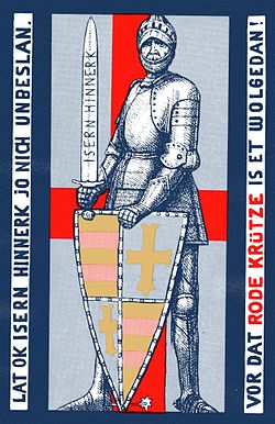 sern Hinnerk , Bildpostkarte des Roten Kreuzes in Oldenburg (Oldenburg) 1915. Ritterfigur vor der blau-roten Landesflagge des Großherzogtums Oldenburg mit niederdeutschem Spendenaufruf: "Laß Isern Hinnerk nicht unbeschlagen, für das Rote Kreuz ist es wohlgetan".