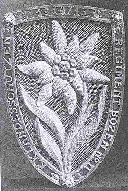 Herbert Kneifel : Das Bozner k.u.k. Kaiserschützenregiment Nr.2. In: Der Schlern. 60. Jahrgang. April 1986. Heft 4. S.219-229. Abbildung 3. "Edelweißschild - mit "Spendennägeln" beschlagen. Das Foto wurde von einem unbekannten Soldaten gemacht und 1915/16 von Oberst Povolny der Ennser Stadtgemeindevorstehung übermittelt. Das Foto ist als bald 100 Jahre alte amtliche Fotografie gemeinfrei, zumals es keine besondere Schöpfunghöhe besitzt und der Fotograf höchst wahrscheinlich im Ersten Weltkrieg ums Leben gekommen sind.