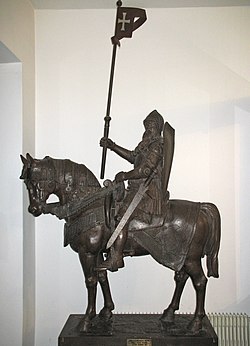 eine mit Metallplättchen beschlagene Holzfigur, die einen Reiter aus der Zeit von König Matthias Corvinus darstellte und vom Bildhauer Ferenc Sidló geschaffen wurde. Sie wurde am 12.September 1915 enthüllt und blieb bis November 1924 auf seinem Platz, vor dem Anker-Haus. Nach der Renovierung kam sie zuerst in den Hof der Militärakademie Ludovika. 1968 kam der Kopf des Ritters ins Kiscelli Museum. Bruchteile und die Gipsform des Denkmals wurden ins Depot des Museums der Heeresgeschichte im Burgviertel gebracht.