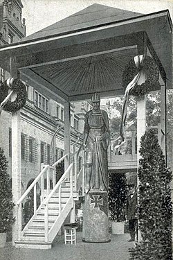 Aachen: Eine von Carl Burger entworfene Rolands-Figur in der Rotunde des Elisenbrunnens, erste Nagelung am 26.September 1915