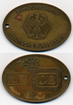 | Ausweismarke des Fahndungsdienstes der Deutschen Bundesbahn, wie sie von 1974 bis 1992 verwendet wurde. Ein Teil der Dienstnummer wurde per Bildbearbeitung unkenntlich gemacht. | Eigenes Werk ( Originaltext: Eigene Aufnahme ) | Drucker03 | Datei:Dbbapoalt.png | |