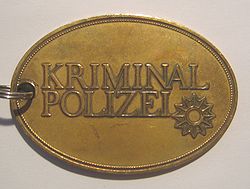 - ↑ So z. B. in den Bundesländern Hessen (Kriminaldienstmarken für die Beamtinnen und Beamten der Kriminalpolizei und die Zivilstreifen der Schutzpolizei, Z. 7, Erlass des Hessischen Ministeriums des Innern und für Sport vom 1. Februar 2011, StAnz. S. 282 verkündet am 21. Februar 2011) und Nordrhein-Westfalen (Polizeidienstausweise, Kriminaldienstmarken und Visitenkarten, Runderlass des Innenministeriums - 43.1-58.02.09 vom 12. April 2010, MBl. NRW. 2010, S. 578.) vorgesehen.