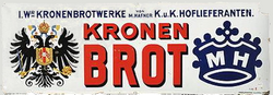 | Altes Logo und Reklame von Kronenbrot. "I. Wr. Kronenbrotwerke von M. Hafner, K. und K. Hoflieferanten", mit kaiserlichem Doppeladler. Randst. Emaillierwerke Austria Wien, 55 x 155 cm. | 1 | Anonym Unknown author | Datei:Kronenbrot Reklame 001.png | |