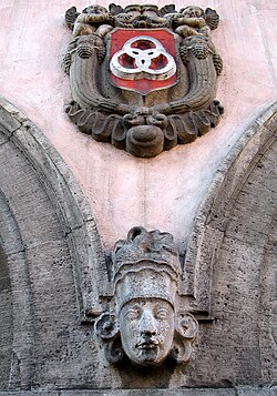| Bauschmuck des Bildhausers Ludwig Vierthaler an der Fassade des Georg von Cölln-Hauses , Am Markte 8 in Hannover gegenüber dem Eingang der Marktkirche ; zwischen den Pfeilern der Arkaden ein typischerweise aus Muschelkalk gehauener Kopf, darüber in Form eines Wappens das Logo der Friedrich Krupp AG , die drei nahtlosen Eisenbahn-Radreifen von Krupp ... | Eigenes Werk | Foto: Bernd Schwabe in Hannover | Datei:Bauschmuck von Ludwig Vierthaler am Georg-von-Cölln-Haus, Am Markte 8, Hannover, 02a, Kopf und Wappen der Friedrich Krupp AG Stahlbau.jpg | |