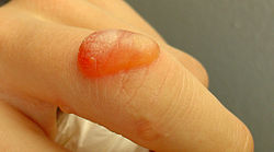 Blasenbildung nach Vereisung einer Warze | Selbst fotografiert ( Originaltext: selbst fotografiert ) | A. Malis / Alis malis in der Wikipedia auf Deutsch | Datei:Kryotherapie.jpg | |