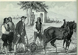 | Kaiser Joseph II. führt den Pflug; das als "Furchenzug" bekannt gewordene Ereignis fand 1769 im mährischen Slawikowitz statt. Während seine Kutsche am Weg repariert werden musste, half der Kaiser dem Bauer Andreas Trnka und dessen Knecht Jan Kartoš beim Pflügen. | http://www.univie.ac.at/hypertextcreator/ferstel/site/browse.php?arttyp=k&artiid=1029# , Stich wurde aus folgendem Werk gescanned: Siegmund Frauendorfer: Ideengeschichte der Agrarwirtschaft und Agrarpoliti im deutschen Sprachgebiet. Bd. 1: Von den Anfängen bis zum Ersten Weltkrieg. - Bonn-München-Wien 1957. | Autor/-in unbekannt Unknown author | Datei:Joseph2pflug.jpg | |